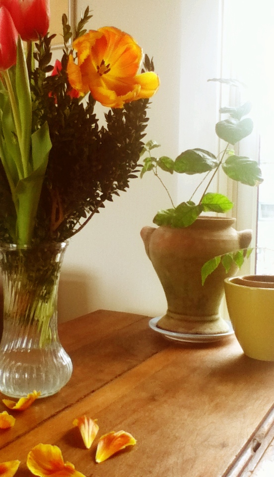One of the pleasures in small time life, as well as living in a small town, is locating a local florist. I’m lucky because our florists are both sophisticated and kind. If on a winter day I wander in, and all that is on my mind are tulips, I’ll get tulips and boxwood, which I hurry home to place in a vase.