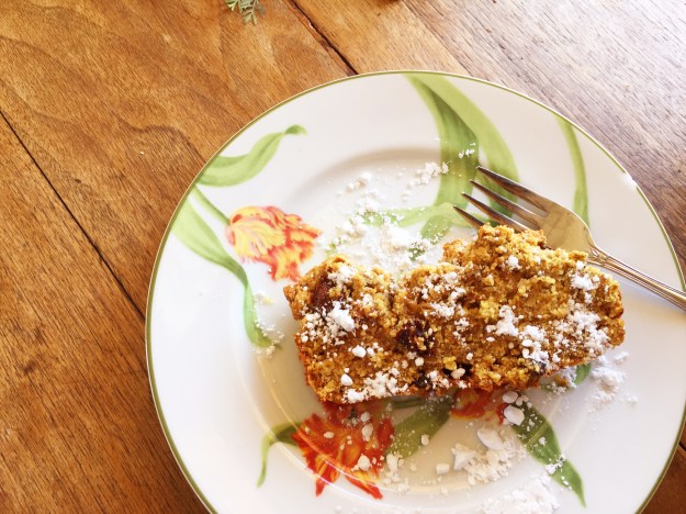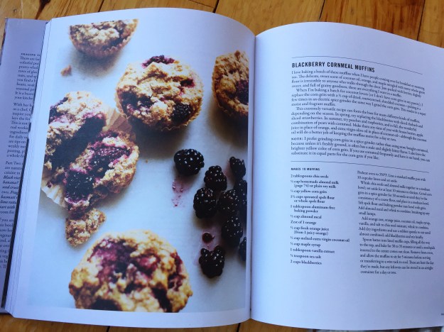 I wanted to try a new recipe for muffins from At Home in the Whole Food Kitchen by Amy Chaplin. I had spelt flour, eggs, and butter, but all I needed, it turned out, was the spelt. So into a bowl went chia seeds (had that) with almond milk (expired) so I substituted milk. While that thickened, I mixed the flour and corn meal (not opting to grind my own, because, you know, I already messed up with the almond milk) with almond flour and baking powder. Did not have a juicy orange which the recipe called for but I had…carrot juice/lemon/ginger/tumeric juice in a bottle, so used that. Did not have blackberries, so I used raisons. Added maple syrup, but had to top it off with agave, and instead of coconut oil (rancid?) I used olive. Hmm. The muffins seemed lacking, so I added chocolate chips, nixed the muffin tray, and dumped it all into a loaf pan. The batter tasted bitter, but it’s baking now. Maybe it needed butter. Better batter, etc.