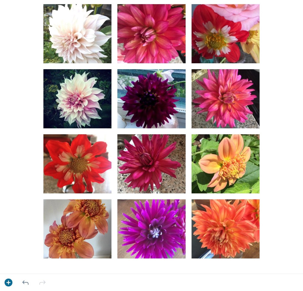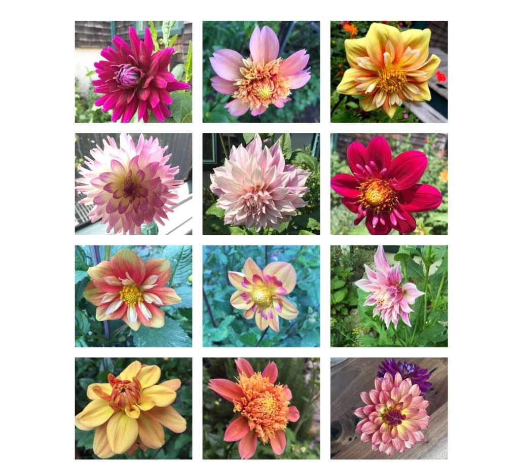 What a dazzling display of dahlias! I aspire to your dozen, but am content, humbled by the one Stormy Daniels plant I received and will do my best to guard it from nibbling insects next year! For now, it’s got one blessed little bud about the size of a pea. There’s hope, even in autumn.