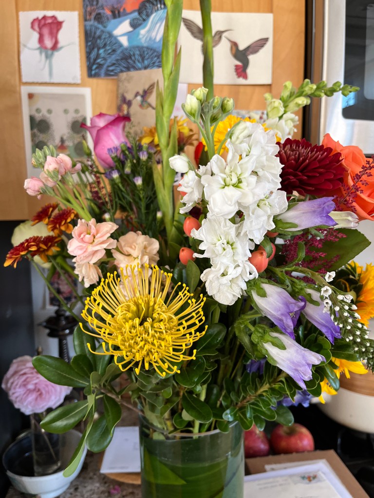 Outside, as I write, the leaves are a brilliant mix of orange and yellow, and the blue sky is puffy with clouds. Robins have been eating the last of the wild berries, and the monument is already strung up with holiday lights. I am not sure why the wasps are active, and I hope they will quietly move. Maybe they came in with the flowers I received from my family. Maybe they hitched a ride. In any case, they are set free, back to nature, to build their nests, grow families.
