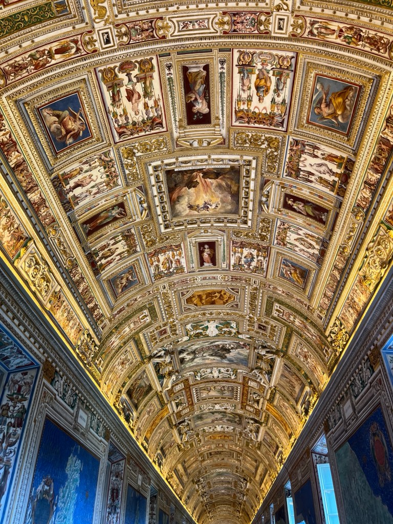 We saw the Roman statuary, the galleries full of maps, the ornate gilt and embroidery, until finally we saw, almost anticlimactically, the Sistine Chapel. God was much nearer than I’d imagined, hovering over my head as Adam reached towards Him, as we were routinely sushed by the priests.