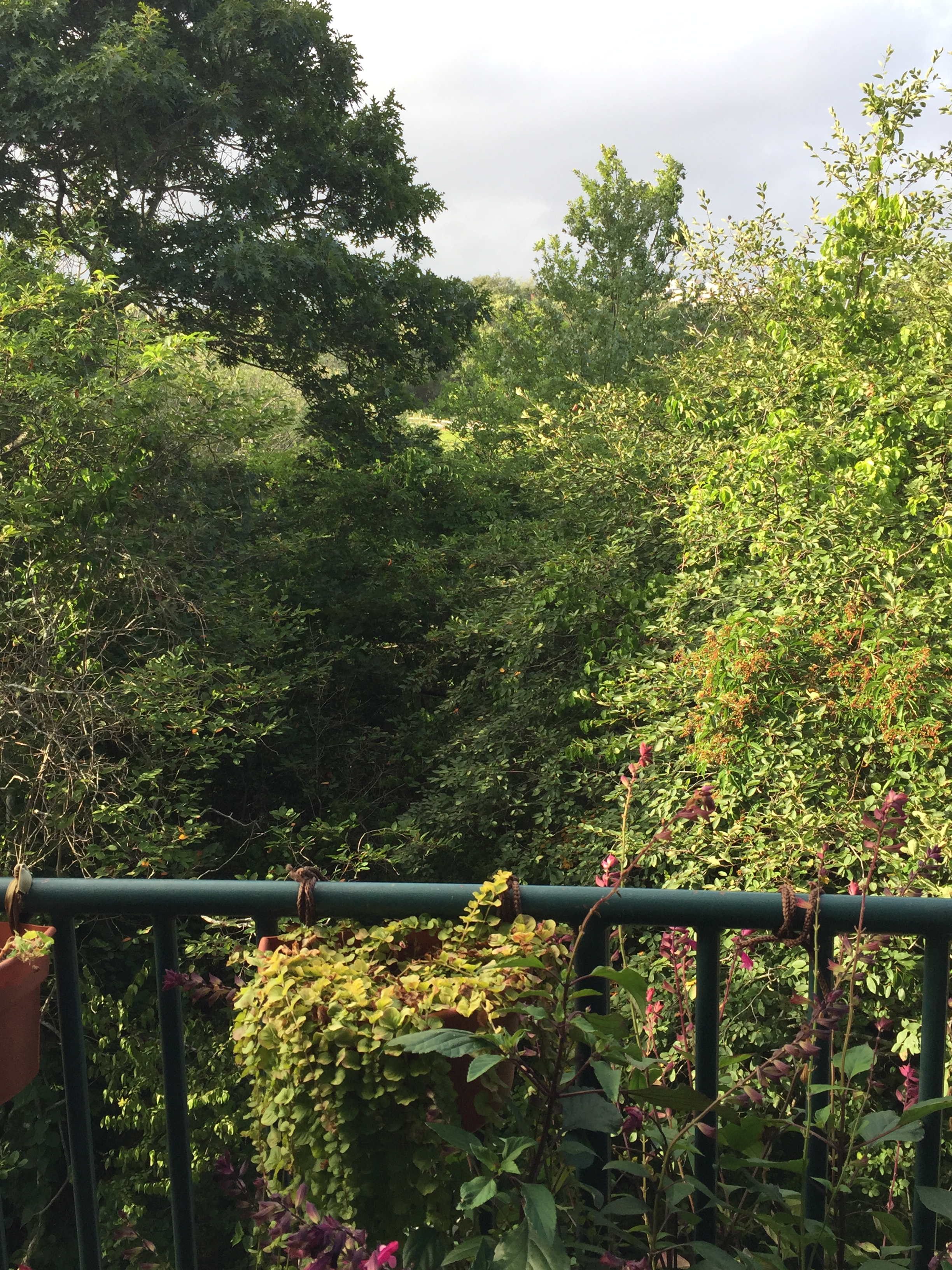 The mourning doves–have I yet said?–are once agin nesting, incubating two brand new eggs, their third brood. This time, they too have sequestered themselves under some chairs, near a Tupperware box full of gardening tools. I worry the space will be too small, but they must know what they are doing.