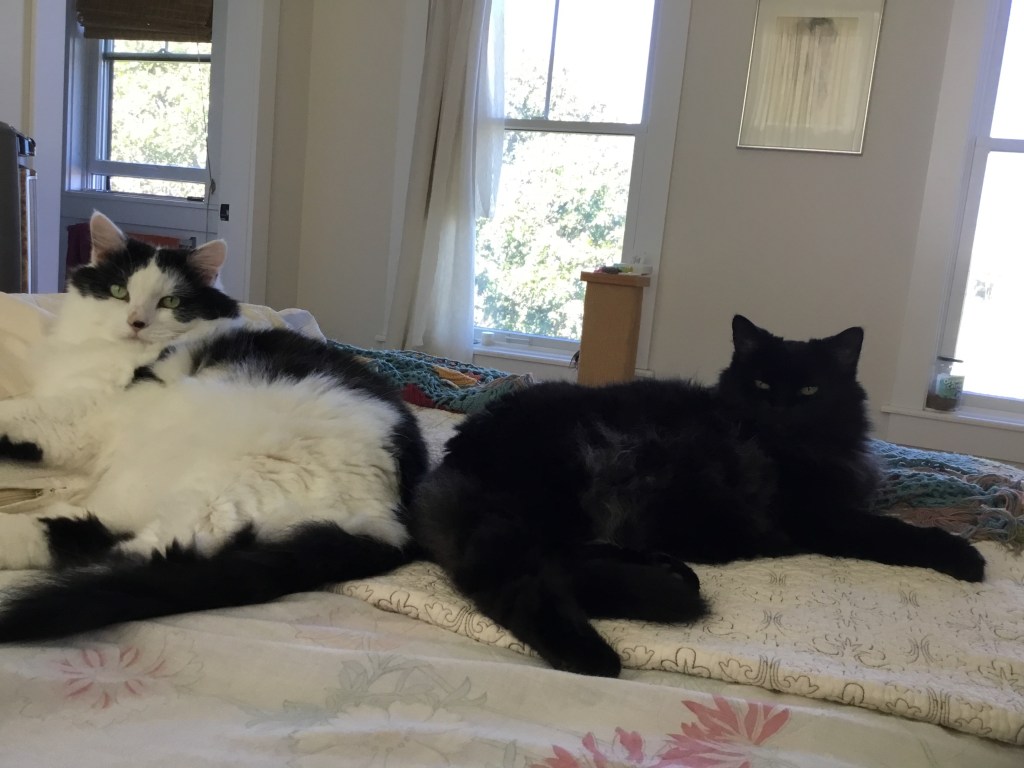 So I think I will pay attention— ah, a second cry, and I’ve brought her upstairs, and now the two cats are hissing at one another. They are mother and daughter, used to having their own space, although on a rare moment, they will lie side by side peacefully.