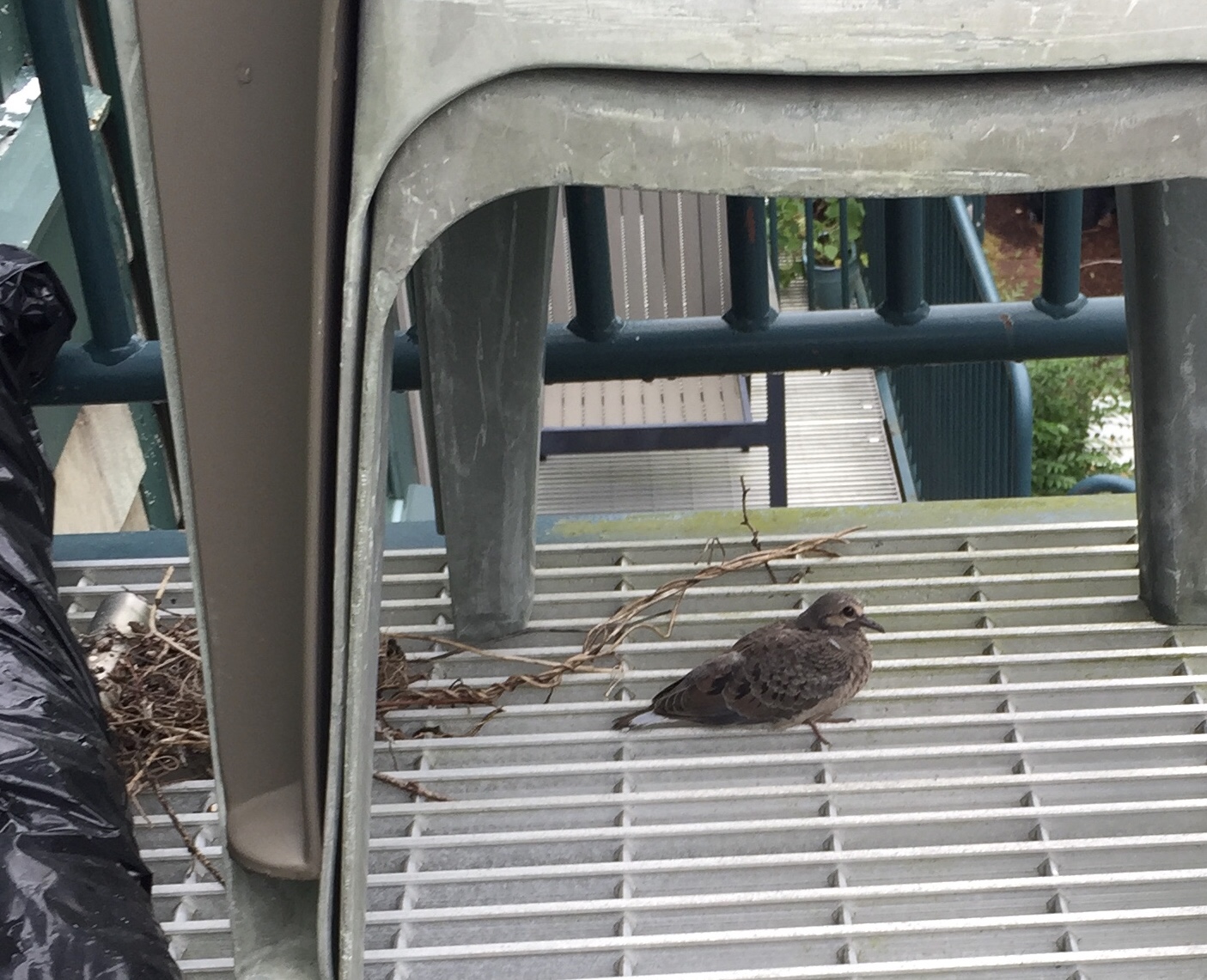This morning I went to check on the mourning dove fledglings that were nesting on my balcony. Since April 23, Shakespeare’s birth/death day, I have been watching this nest, as first the mother came and laid two eggs, then watched the fledgings slowly emerge into sunlight. My research suggested they would be ready to leave the next Saturday, May 23. But it is Friday, May 22, and this morning, the two parent doves were investigating what was an empty nest. After they left, I took a closer look. In the nest was a lump of red something, resembling a dried date, and I worried it was gristle. Had a hawk come and devoured the babies in the night? All day I have opened and closed the sliding door, feeling sick. I examined the ground underneath, and the woods a bit, but found nothing. Now, about twelve hours after my discovery of the empty nest, I take another look. I can hear the mourning doves, somehwere in the woods, cooing, the parents, I think. Mourning.